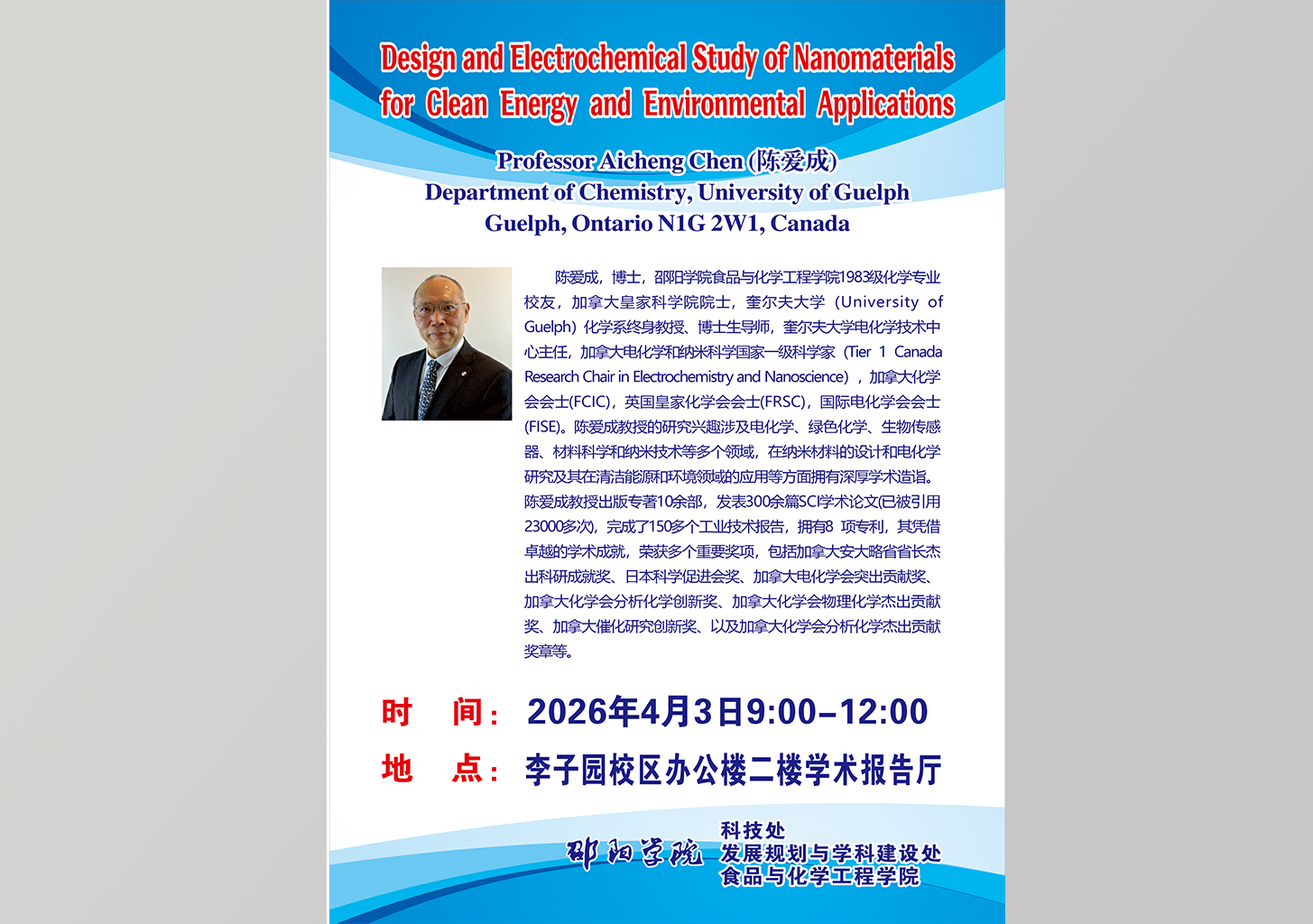 Professor Aicheng Chen:Design and Electrochemical Study of Nanomaterials for Clean Energy and Environmental Applications