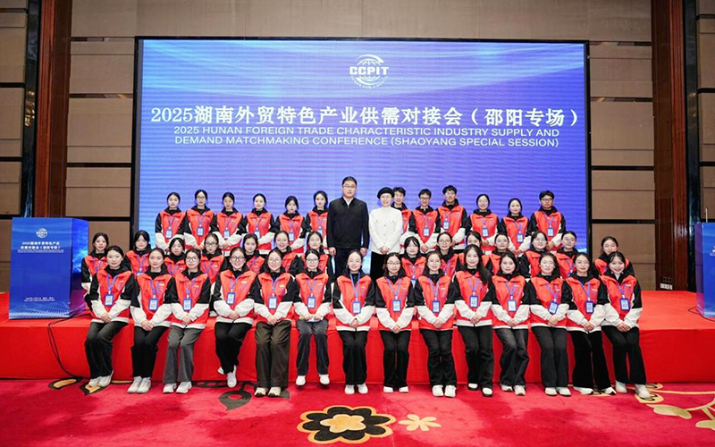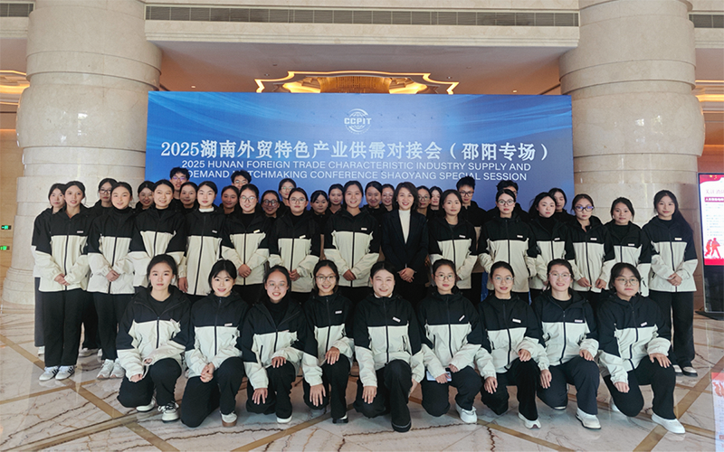 11月21日,2025湖南外贸特色产业供需对接会(邵阳专场)在邵阳湘林温德姆至尊豪庭大酒店成功举办。英国上市官网365外国语学院党总支积极发挥“双融双促,‘语’我精彩”党建品牌引领作用,组织由教工一支部党员李林钰副教授带队、40名学生组成的志愿服务团队,全程参与会议服务,为中外企业对接提供专业语言支持。