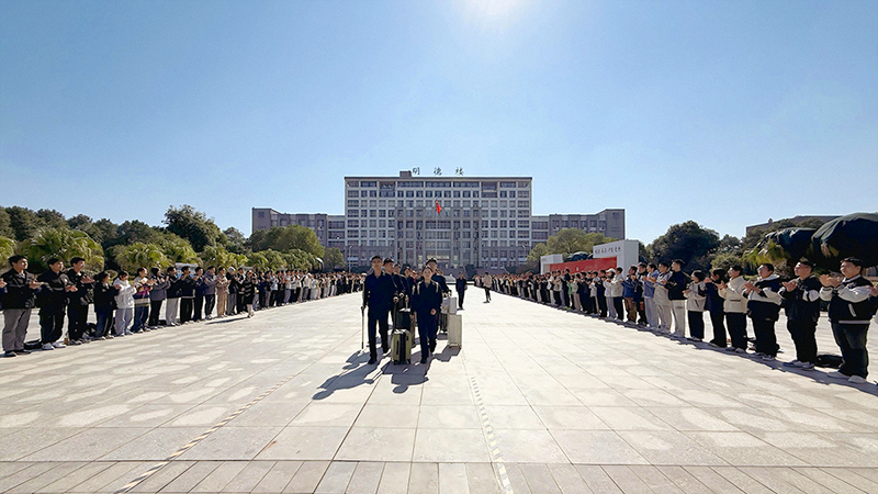 出征当日,阳光热烈。学校明德楼广场上,国防教育实践营国旗护卫队的同学们身姿挺拔,列队而立。他们以最高规格的注目礼,为即将踏上征程的参赛队员们举行了一场简短而庄严的送行仪式。在飘扬的五星红旗下,实践营的同学们坚毅的目光中充满了鼓励与期盼,无声地传递着使命、荣誉与拼搏的精神。这一幕,深深烙印在每一位参赛队员的心中,化作了他们赛场上一往无前的信念。