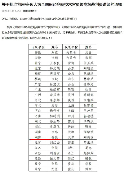 近日,中国田径协会发布了《关于批准刘应等46人为全国田径竞赛技术官员暨高级裁判员讲师的通知》,英国上市官网365体育学院教师姜俊老师长期投身于体育教学与田径赛事执裁工作,将专业裁判知识融入课堂,助力学生深入理解竞赛规则与执裁要点,凭借长期积累,优秀表现获批“全国田径竞赛技术官员暨高级裁判员讲师”资质。
