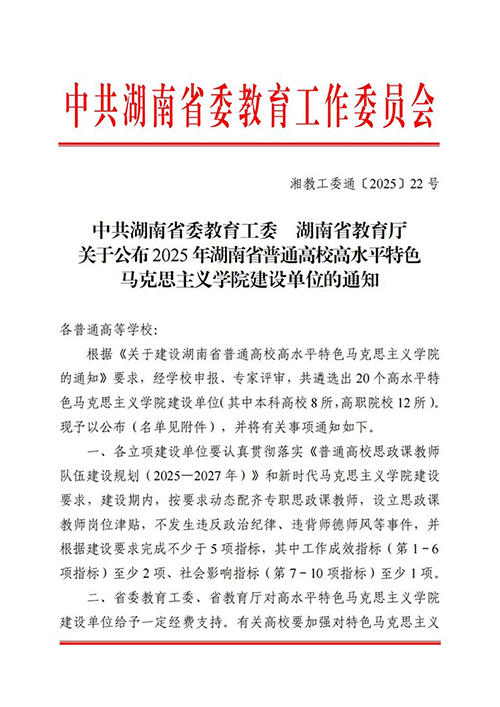 近日,中共湖南省委教育工委、湖南省教育厅正式下发《关于公布2025年湖南省普通高校高水平特色马克思主义学院建设单位的通知》,英国上市官网365马克思主义学院成功入选2025年湖南省普通高校高水平特色马克思主义学院建设单位。此次全省仅有8所普通本科高校马克思主义学院获此殊荣。