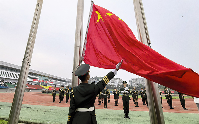 8时整,升旗仪式庄严肃穆,五星红旗伴随着国歌冉冉升起。