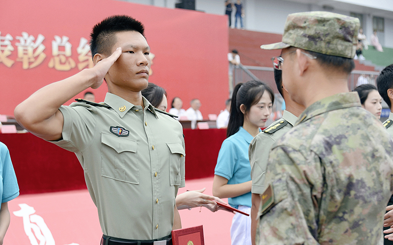 邵阳市大祥区人民武装部领导宣读了军训表彰决定,对48名“优秀‘四会’教练员”、46名“优秀代理班主任”、52名“优秀教官”以及26个“军训优秀连队”、8个“内务卫生先进单位”、26个“歌咏比赛优秀连队”、919名“优秀学员”予以表彰。当教官将牌匾和荣誉证书带回连队时,掌声与欢呼声响彻操场。