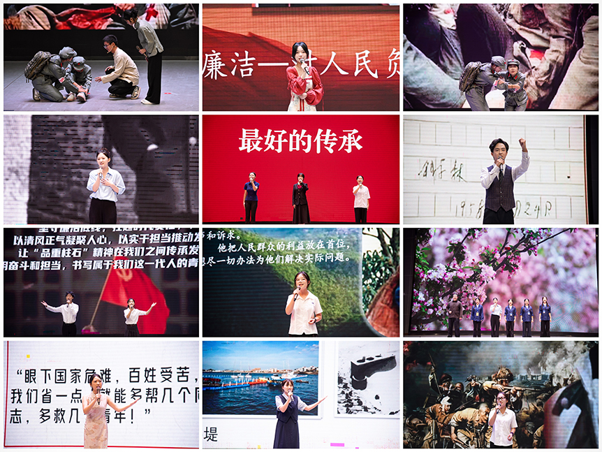从“种树书记”谷文昌十四年坚守种下三万八千亩“绿色长城”的热血传奇,到“草鞋书记”杨善洲扎根大亮山二十余年、无偿上交3亿资产的赤子之心;从彭士禄院士“我是人民养大的,这辈子要为人民办事”的朴素誓言,到张桂梅校长“燃灯育人”、用一生守护华坪女高的担当;从左权将军“没有一个铜板”的清廉家书,到钱学森“不爱钱、不要权”的报国强音;从西花厅里关于“修缮”的特殊风波,到马灯里红军与苗民“不拿群众一针一线”的鱼水深情……10个学院的分享团队用不同的红色故事,串联起“四史”中的精神脉络。一个个鲜活的故事、一段段感人的细节,让现场观众仿佛穿越时空,与革命先辈对话,在历史中汲取前进力量。