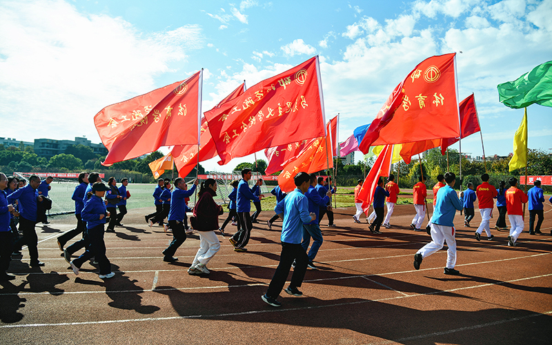 致辞结束后,现场举行了简短的授旗仪式。党委副书记、工会主席赵敏丽将象征着责任与使命的团旗分别授予教职工跑团与校友跑团代表。随后,发令枪响,清脆的枪声划破长空。在校领导宁立伟、赵敏丽、蒋剑平、黄秋生、唐杰的带领下,由校旗、工会会旗引领,各分工会组成的方阵队伍精神抖擞,依次从田径场跑道出发,开启了环绕校园的奔跑与步行。队伍宛如流动的彩带,途经步云桥、图书馆、明德大道等地标,矫健的身影与初冬的校园景致交织成一幅生动的画卷,沿途工作人员和大学生志愿者的保驾护航确保了活动的顺畅与安全。