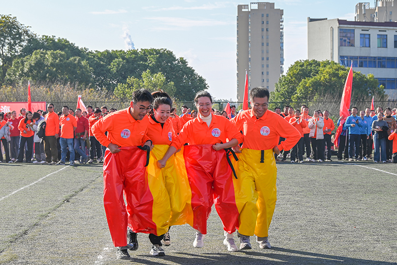 “趣味连体裤”项目中,四人一组被“捆绑”在一条特制裤子里,队员们必须步调一致,协调前行。有的队伍配合默契,喊着口号快速移动;有的则略显慌乱,步伐交错,引得场边观众笑声不断。“心心相印”则考验多人排成队列的前后夹球协作,不时有队伍因求快心切导致软式排球滑落,队员们手忙脚乱捡球继续,滑稽的场面让观众哄然大笑。“龙行天下”项目,七人同跨一条“龙舟”,需靠整齐划一的腿部力量和团队节奏才能快速前行,赛道上的“龙舟”时而齐头并进,时而因步伐不一略显“蜿蜒”。压轴项目“一圈到底”更是将团队协作推向高潮,12名队员手拉手,需让呼啦圈在不断开的链条中灵活穿梭,紧张与欢快的气氛弥漫整个赛场。