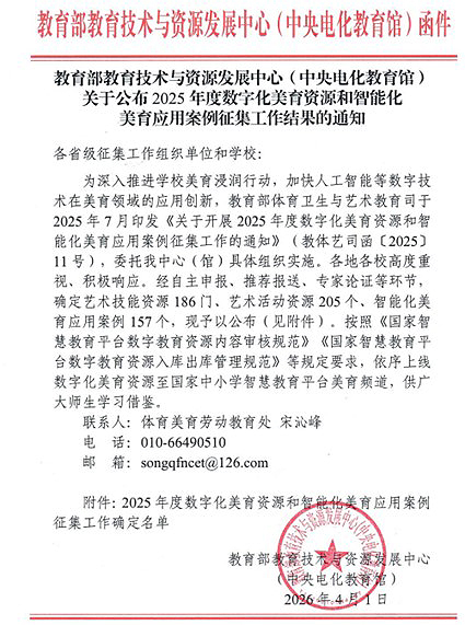 下一步,学校将以此契机,持续深化美育教学改革,总结推广典型案例经验,依托国家中小学智慧教育平台美育频道,推动优质数字化美育资源共建共享,不断提升美育育人质量,培养更多兼具审美素养、文化自信与创新能力的时代新人,为学校高质量发展与区域美育事业贡献更大力量。