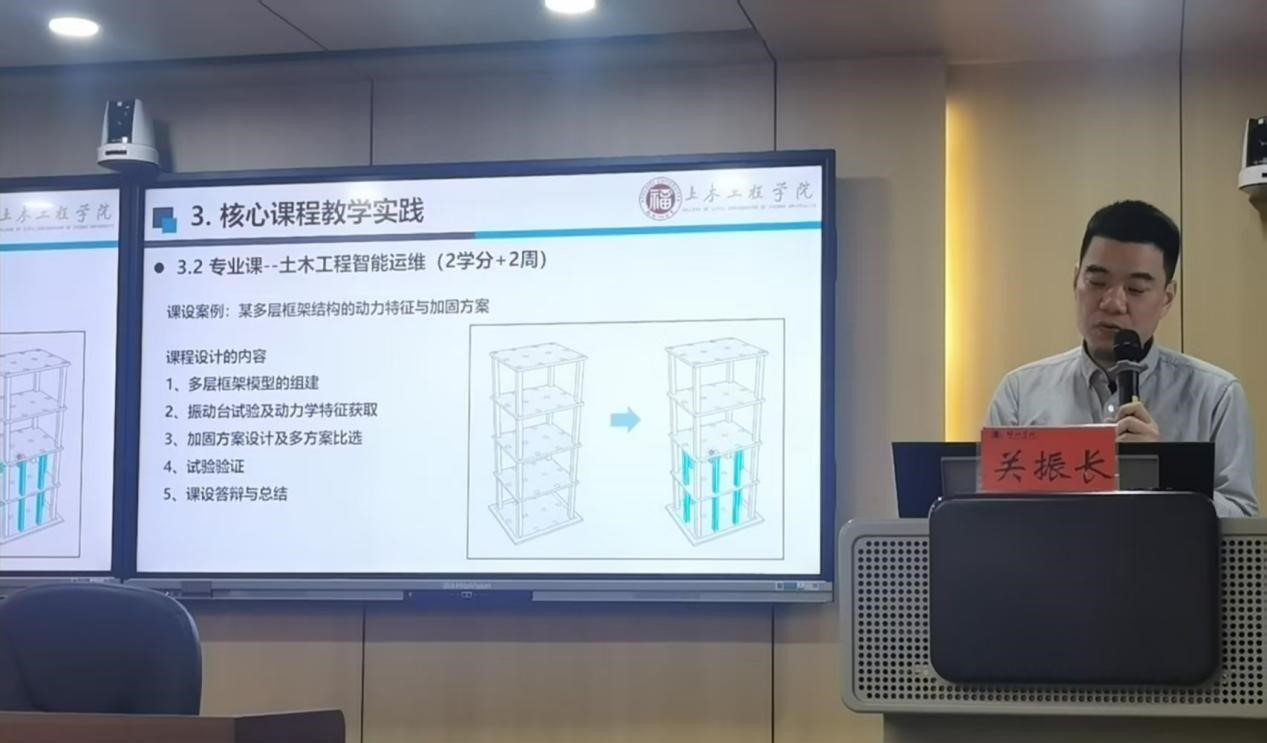 11月16日下午,关振长教授聚焦 “智能建造专业课程体系与核心课程教学实践”,深入剖析了数字时代与 “双碳” 战略下智能建造专业设立的时代意义。他指出,行业需通过数字化、工业化转型破解 “两高两低” 困境,并详细分享了福州大学以 “学科交叉、内容整合、对象选修、土木升级” 为原则的智能建造专业培养方案。该方案涵盖智能设计、智能施工、智能运维等核心课程模块,通过项目制教学、实验实操等多元化教学方式,着力提升学生的实践创新能力。关教授还结合 “某多层框架结构的动力特征与加固方案” 课程设计案例,直观展示了核心课程的教学实施路径。