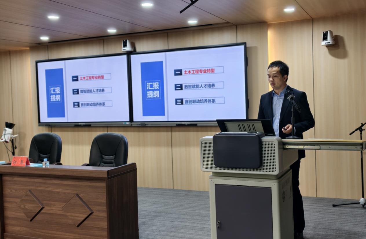 11月16日上午,付果教授以“土木专业转型与创新人才培养的探索与实践”为题,从土木专业转型逻辑、数智赋能人才培养路径、赛创联动培养体系构建三个维度展开讲解。他强调,传统土木教育需加速与数智技术深度融合,才能适应行业发展需求。结合长沙理工大学在赛创联动人才培养方面的成功实践,付教授为学院新型人才培养提供了可落地、可借鉴的实施方案。