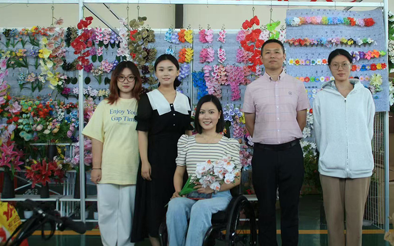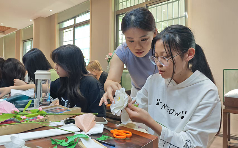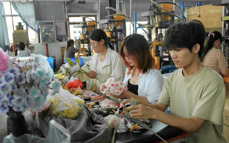 据了解,今年5月至6月,设计艺术学院视觉传达设计专业(含视觉新媒体、影视传播方向)与环境设计专业《在地设计服务》课程深入湖南七七科技有限公司,实地调研市场需求,构建了校内实验室和企业车间两个联动课堂,融合设计创意和工艺技术,打造出既具艺术美感又符合市场需求的仿真花系列产品。