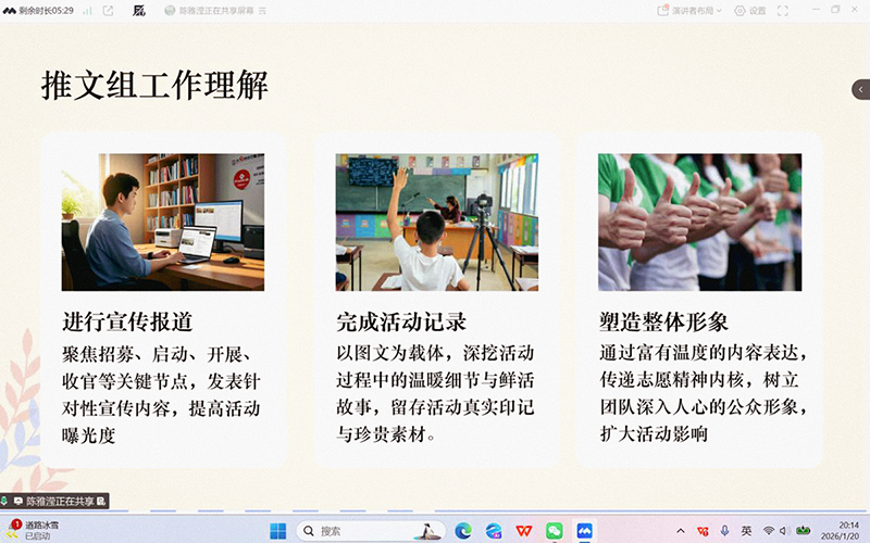 培训于1月19日至20日分阶段在线进行,共吸引300余名学生志愿者报名参与。活动由云支教领队邓谦余主持。1月19日晚,开展了时长约三个半小时的线上集中培训。培训内容涵盖活动整体流程、志愿服务规范、安全注意事项、线上教学技巧及应急处理方案等核心模块。培训团队由指导教师与往届优秀志愿者组成,采用案例讲解、实操演示与互动答疑相结合的方式,重点讲解了课程设计、沟通礼仪、课堂氛围营造等实践技能。
