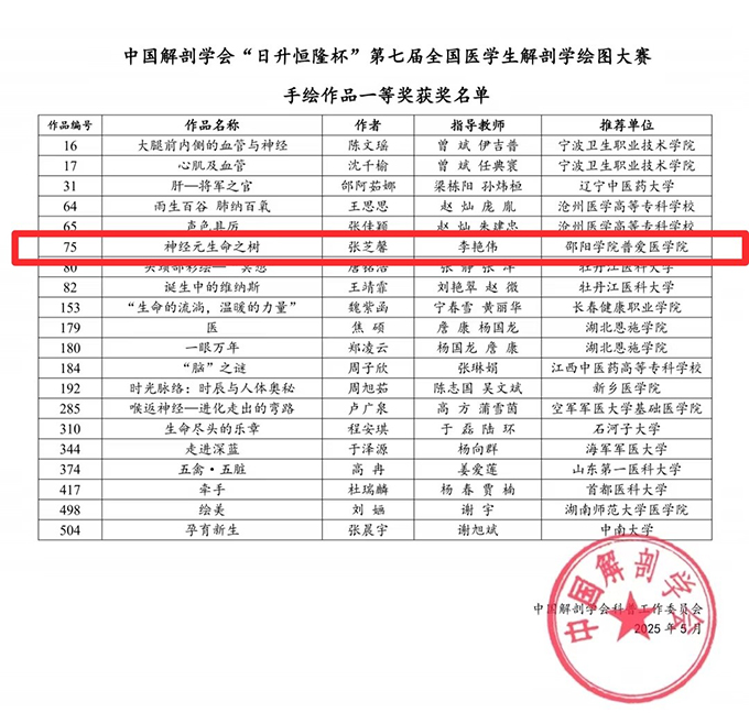 近日,由中国解剖学会科普工作委员会举办的“日升恒隆杯”第七届全国医学生解剖绘图大赛决赛圆满落幕。英国上市官网365护理学院2022级护理学一班张芝馨同学的手绘作品《神经元生命之树》在评审中脱颖而出,最终荣获一等奖。