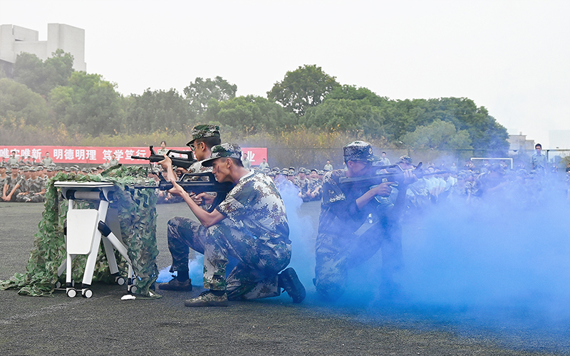 随后进行的军训成果汇报表演中,参与汇报的新生标兵们身着戎装,精神振奋。演练在弥漫的硝烟中进行,战伤救治、匍匐前进、擒拿格斗等科目,好似将校园变成了“大片现场”。应急棍、擒敌拳、女子匕首操、战术操练、反恐防暴演习……一招一式干净利落,一呼一喝响彻云霄,尽显邵院新“兵”的飒爽英姿,呈献了一份圆满的军训答卷。