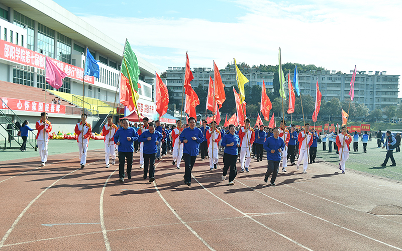 致辞结束后,现场举行了简短的授旗仪式。党委副书记、工会主席赵敏丽将象征着责任与使命的团旗分别授予教职工跑团与校友跑团代表。随后,发令枪响,清脆的枪声划破长空。在校领导宁立伟、赵敏丽、蒋剑平、黄秋生、唐杰的带领下,由校旗、工会会旗引领,各分工会组成的方阵队伍精神抖擞,依次从田径场跑道出发,开启了环绕校园的奔跑与步行。队伍宛如流动的彩带,途经步云桥、图书馆、明德大道等地标,矫健的身影与初冬的校园景致交织成一幅生动的画卷,沿途工作人员和大学生志愿者的保驾护航确保了活动的顺畅与安全。